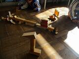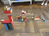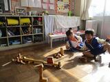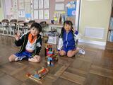 本日の算数から、「かたちあそび」の学習に入りました。立体図形に親しむため、学校にある算数教材の箱にたくさん入っている積み木を使い、どの形を生かすとよいか、高く安定して積むにはどうしたらよいかなど考えながら、2人組で作品を仕上げました。